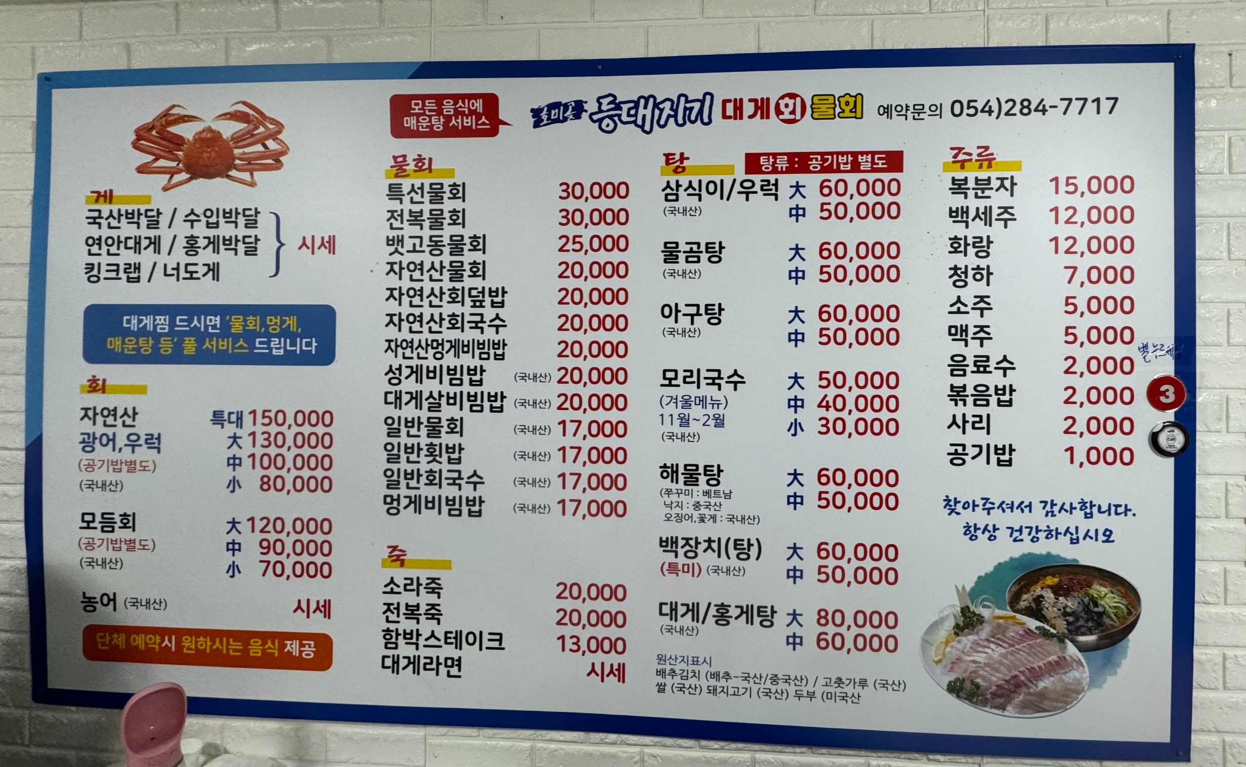 기본 회뿐만 아니라 점심에도 간단하게 먹을 수 있는 물회와 탕 종류도 있고 대게도 있어요